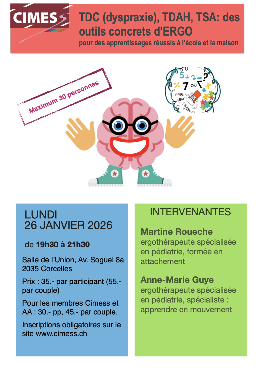 Lundi 15 septembre : Atelier “La dyspraxie (TDC) au quotidien : un peu de théorie et beaucoup de pratique”, animés par Martine Roueche et Anne-Marie Guye (Ergothérapeutes)