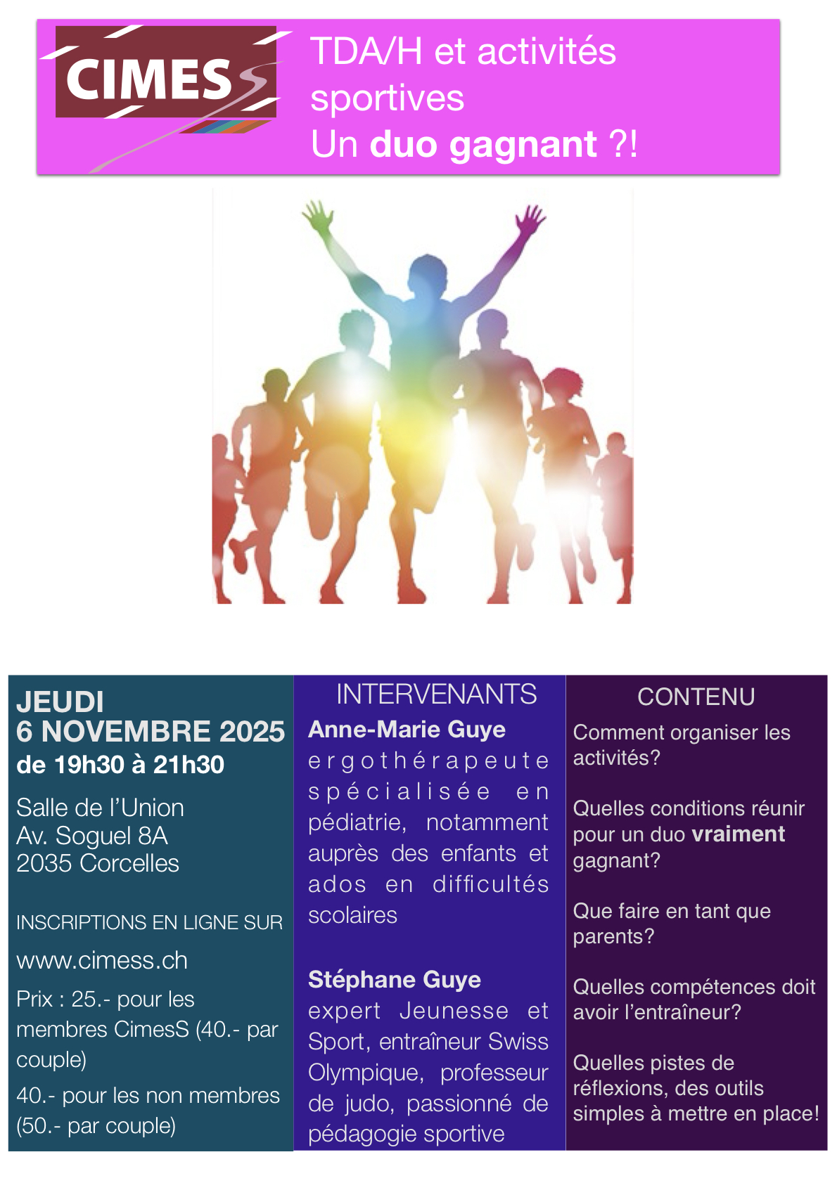 Jeudi 6 novembre 2025 : Conférence TDA/H et activités sportives, Un duo gagnants ?!, animés par Anne-Marie Guye (Ergothérapeute) et Stéphane Guye (Expert Jeunesse et Sport)